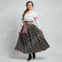 Костюм  выполнен из габардина и красиво подобранного декора в золотистых цветах. Достоинства габардина  в том, что он не мнется, не блестит, как атлас, ложится красивыми  мягкими складками, цвет не выгорает. Юбка  с оборкой, декор в золотистых цветах, по талии на  двойной резинке. Блуза  белого праздничного цвета, с баской,  рукава расширены внизу, с манжетами.   Сзади на блузе шнуровка. Она дает хорошую посадку по фигуре. Костюм предназначен для творческих  сольных и коллективных театральных выступлений.