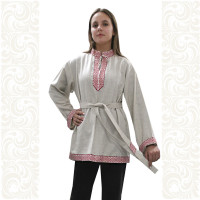 Льняная женская рубаха с коротким втачным рукавом, прекрасно подойдет для проведения традиционных славянских праздников и выступлений. По вороту, низу изделия, рукавам расположен декор из жаккардовой тесьмы с обережным рисунком. Модель комплектуется кушаком (поясом) из ткани с тесьмой.