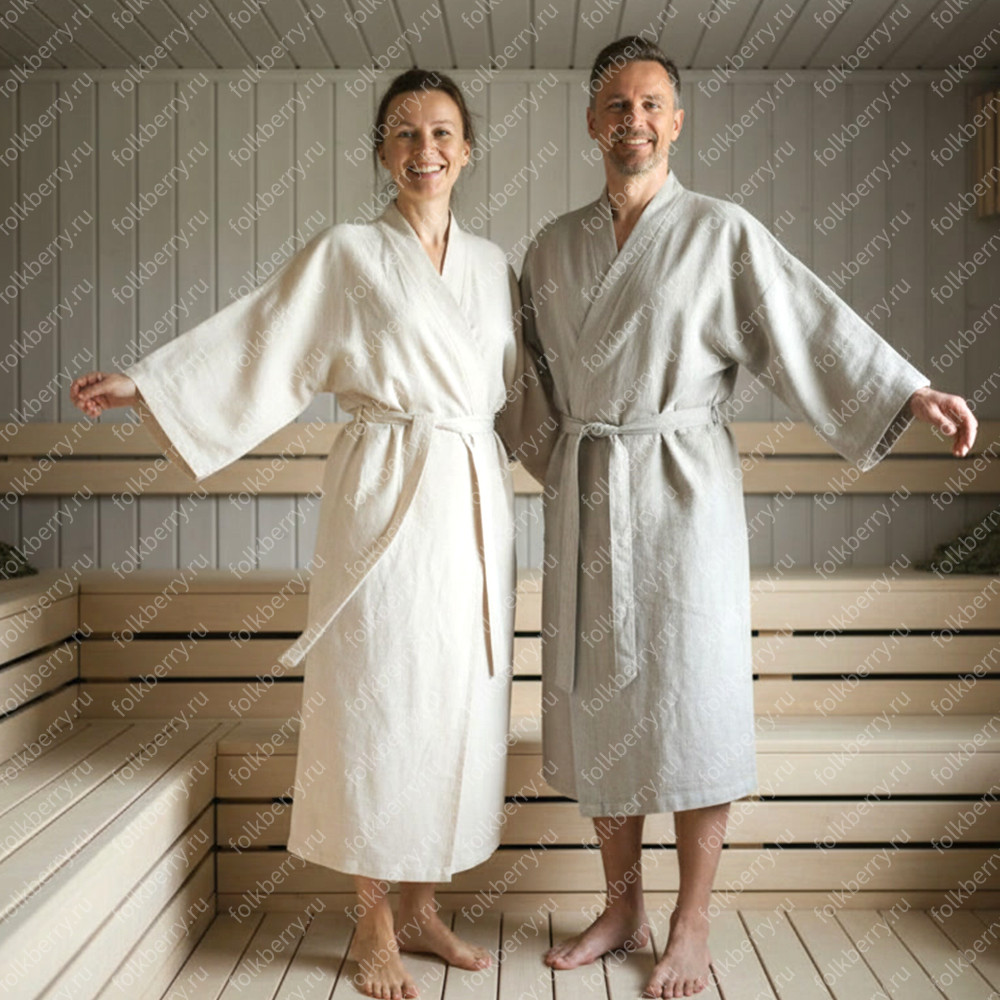 Халат банный предназначена для банщиков, массажистов и любителей бани и сауны. Сшита из мягкого комфортного льна светло-серого цвета, ткань натуральная, не окрашенная красками, дышащая, не колючая.