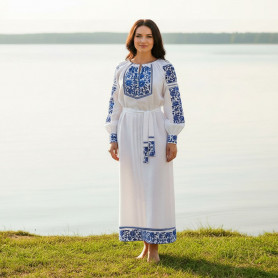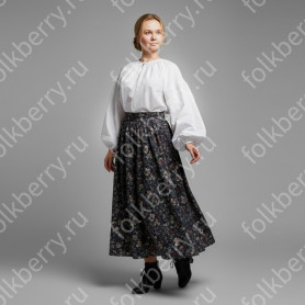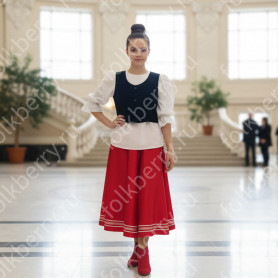 Косоворотка украшена жаккардовой тесьмой и вьюнком, контрастирующей по цвету с основной тканью. В комплекте с изделием идет кушак.