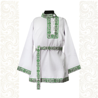 Косоворотка «Добрыня» выполнена в соответствии с традиционным русским стилем. Изделие сшито из льняной ткани и украшено гармонично сочетающейся жаккардовой тесьмой. В комплект с рубахой идет кушак с кистями из пряжи.