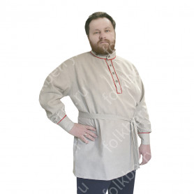 Сшита косоворотка из льняной ткани, скомбинирована из двух цветов – основной и красной по низу рукава и рубахи. Декорирована по вороту и груди жаккардовой тесьмой. Выглядит праздничной, яркой и нарядной.