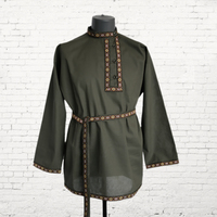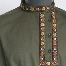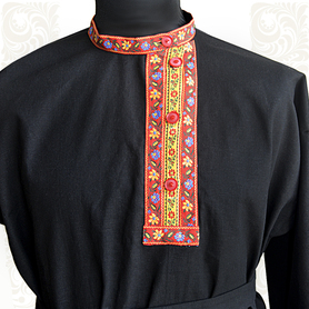 Косоворотка – традиционная русская рубаха. Модель «Народная» черного цвета изготовлена из натуральной хлопковой ткани, укомплектована кушаком. Благодаря черному цвету косоворотка смотрится не только традиционно, но очень современно и стильно, поэтому ее часто покупают. Некоторые элементы рубахи, в том числе пояс, украшены узорчатой тесьмой.
