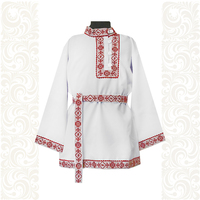 Эта модель косоворотки предназначена для детей, подростков и взрослых мужчин. Подходит как для традиционных русских мероприятий, так и для повседневной носки. Рубаха изготовлена из хлопка, украшена жаккардовой тесьмой с орнаментом по вороту, низу рукавов и самой косоворотки, имеет прямой крой, может подвязыватся поясом, который входит в комплект.