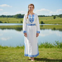 Декор платья - жаккардовая тесьма со славянскими символами. Талия немного завышена, пояс в комплекте.