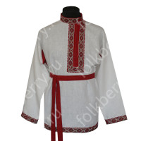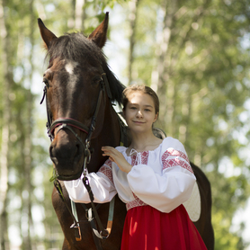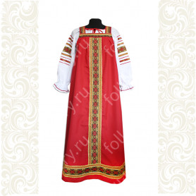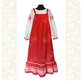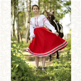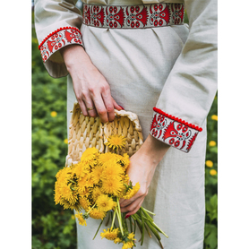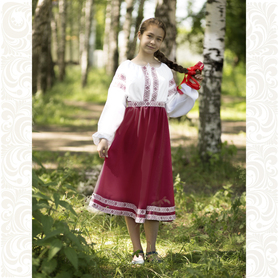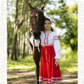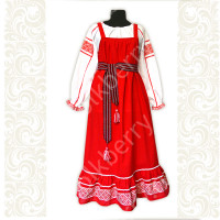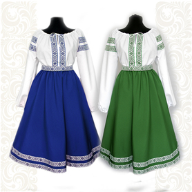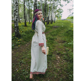 Платье  нежного красивого голубого цвета универсальное, т.к. хорошо садится по фигуре, благодаря регулируемой горловине, рукаву реглан, наличию длинного пояса.  Юбка (почти солнце) длиной немного ниже колена эффектно смотрится в танце. Талия слегка завышена. Декор платья - жаккардовая тесьма с обережными символами. Платье сшито из габардина, матовой, немнущейся ткани ярких цветов.