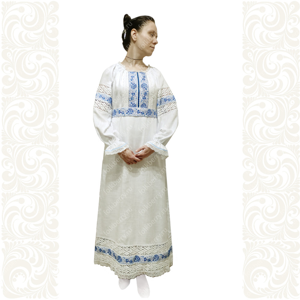 Платье «Кружевная Гжель» -  женственный фольклорный наряд подойдет для особых случаев, например, для венчания или участия в славянских праздниках.