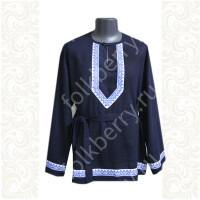 Платье изготовлено из умягченного белого льна и украшено жаккардовой тесьмой с узорами Гжель и  белым кружевом разной ширины, а также бархоткой и  изысканной серебристой тонкой тесьмой. Платье силуэта А, расклешено к низу. В комплект входит  пояс с веревочками на концах. Рукава - удобный реглан, также декорированы кружевом и  жаккардовой тесьмой. Платье немного просвечивает, желательно надевать с легким подъюбником или юбкой-поневой.
