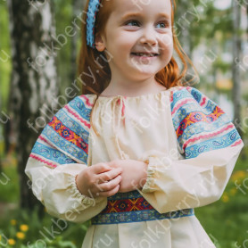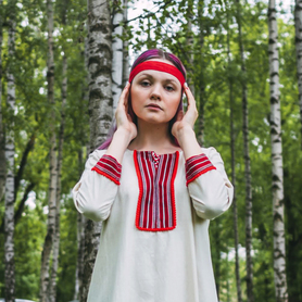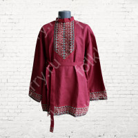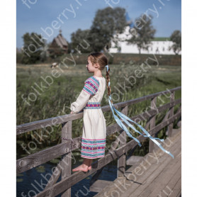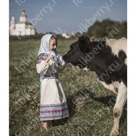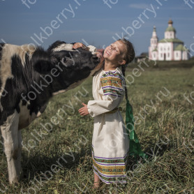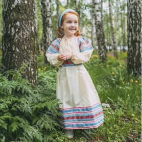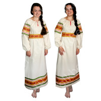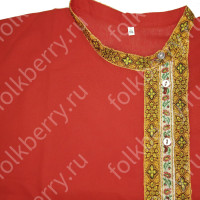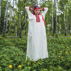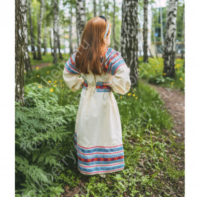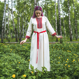 На рукавах и подоле между красным кружевом вставки из шитья. Горловина регулируется по ширине, т. к. собрана на резинку Платье слегка расклешено к низу. В комплект входит длинный пояс украшенный кружевом. Платье хорошо сочетается с юбкой поневой из ажурного шитья Белая птица. В пару к этому платью подходит мужская косоворотка из белого льна Православная, Оберег, рубаха мужская Истоки
