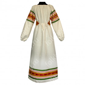 Платье изготовлено из умягченного льна белого цвета,  украшено красным и белым кружевом, а также бархоткой,  изящной тонкой блестящей тесьмой.