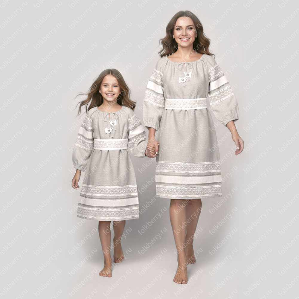 Платье «Верея» выполнено из натурального, умягченного льна. Платье А-силуэта, имеет регулируемую горловину, удобный рукав реглан. К платью прилагается широкий пояс, украшенный кружевом. По рукавам и низу платье декорировано широким бордюром из нескольких видов натурального кружева из хлопка, машинной вышивкой и вставками из белого льна. Платье комфортно, смотрится очень мило и  женственно.  Хорошо сидит на разного вида фигурах, в том числе  на крупной и полной фигуре.  Платье можно надевать как с поясом, так и без. Пояс можно надевать с другими изделиями ( например, блузой)