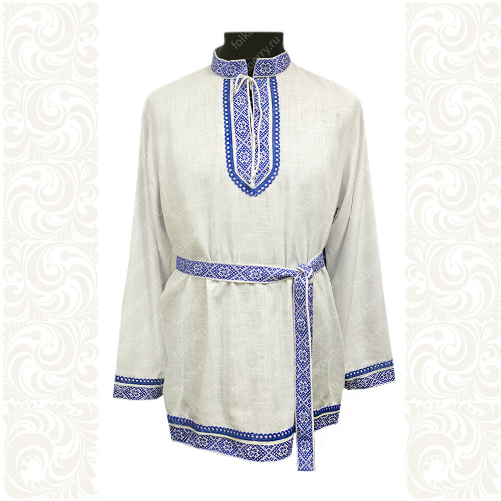 Рубаха мужская в современном славянском стиле "Колосок"  из  белого льна с синим декором.