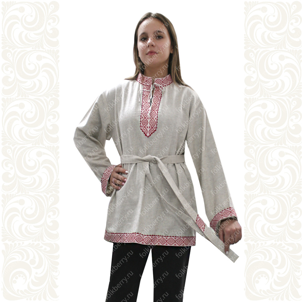 Льняная женская рубаха с коротким втачным рукавом, прекрасно подойдет для проведения традиционных славянских праздников и выступлений. По вороту, низу изделия, рукавам расположен декор из жаккардовой тесьмы с обережным рисунком. Модель комплектуется кушаком (поясом) из ткани с тесьмой.