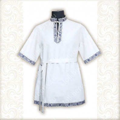 Льняная мужская рубаха «Истоки» с коротким втачным рукавом, прекрасно подойдет для проведения традиционных славянских праздников и выступлений. По вороту, низу изделия, рукавам расположен декор из жаккардовой тесьмы с обережным рисунком. Модель комплектуется кушаком (поясом) из ткани с тесьмой.