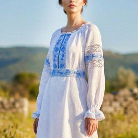 В комплект входит блуза из натурального хлопка с рукавами-реглан, завершающимися воланом с кружевом. Горловина регулируется, т к собрана на тесёмку, а по краю украшена натуральным хлопковым кружевом — нежным, но прочным, добавляющим образу лёгкости и женственности.