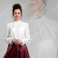 В комплект входит белая блуза из мягкого хлопка с длинными рукавами-реглан, завершающимися воланом, украшенным натуральным хлопковым кружевом. Горловина аккуратно стягивается тесёмкой, позволяя легко регулировать вырез, а по краю — тонкое кружево, добавляющее образу воздушности и благородной скромности.