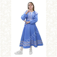 По типу это самый древний, глухой - закрытый сарафан. Традиционный покрой: горловина под горло, кокетка спереди и сзади, мелкие складки на груди и по спине, застежка на пуговки спереди, далее сарафан ниспадает, создавая плавный, благородный силуэт. Ширина по низу — 3 метра, что придаёт каждому движению величие и певучесть. Внутренний хлопковый подбой сохраняет форму изделия и продлевает срок его службы.