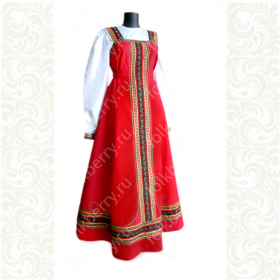 Приталенная модель хорошо сидит по фигуре, расклешенная книзу дает крупные мягкие волны. Сзади расположена застежка «молния». Талия дополнительно подчеркивается поясом. Плечики регулируются по длине. Сарафан украшен широкой полосой из жаккардовой тесьмы, вьюнка, золотистого шнура, кружева.