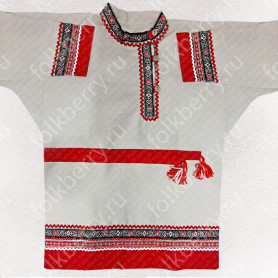 Сарафан с блузой «Глаша» выполнен из небеленного льна в традиционном славянском стиле. Модель отличается свободным кроем, украшена красной жаккардовой тесьмой с цветочным рисунком, золотистой тесьмой и «вьюнком». Бретели сарафана регулируются по длине. Комбинированная блуза из хлопка со вставками из льна с длинным рукавом украшена таким же, как и сарафан, орнаментом.