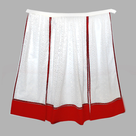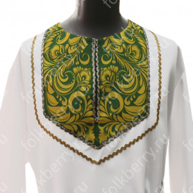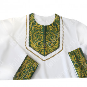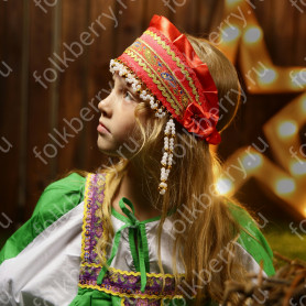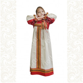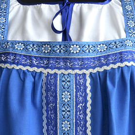 Сарафан декорирован широкой полосой  жаккардовой тесьмы, блестящего шнура, вьюнка, кружева, что придает изделию дополнительные красоту и торжественность.
