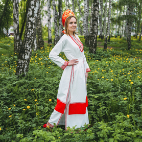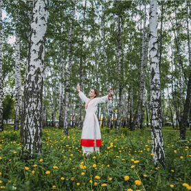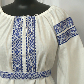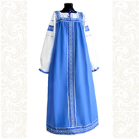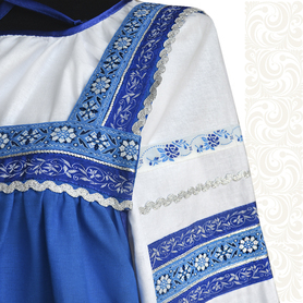 Сарафан с блузой Красна девица в голубом цвете – очень женственная модель русского сарафана. Вверху сарафан идеально облегает грудь, мягко облегает  талию, плавно расклешается до 3 метров в диаметре внизу.