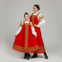 Сарафан средней длины, примерно на 10-15 см ниже колена. Пояс выполнен из поясной традиционно тканой ленты, с кистями в конце. Сарафан можно носить с поясом и без него. Бретели регулируются по длине.Белая блузка из хлопка с длинным рукавом реглан украшена декором, вьюном и натуральным кружевом.В качестве головного убора подойдет кокошник Леля, Девичья повязка Ладушка, Сорока или Кичка.