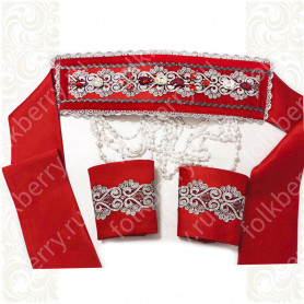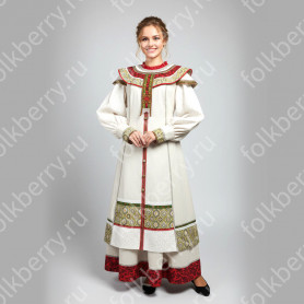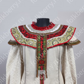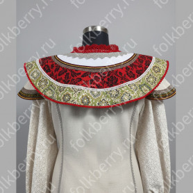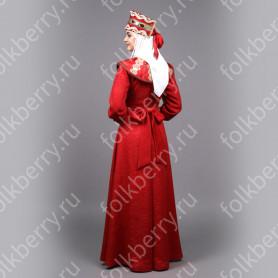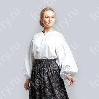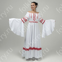 Выполненный в православном стиле сарафан с блузой «Дуняша» сшит из натурального хлопка в цветочек. Модель скромно декорирована однотонным воланом в цвет с основной тканью и тесьмой вьюнок. Можно носить под пояс и регулировать бретели по длине. Белая блузка из хлопка с длинным рукавом расшита натуральным нежным кружевом.