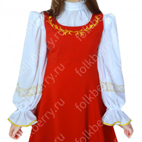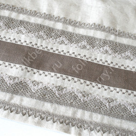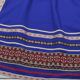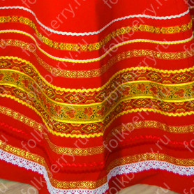 Юбка сшита из ажурного шитья, состоит из трех прямоугольных полотен, соединенных на поясе, украшена красным кружевом, бархоткой в тон, а также блестящей серебристой тесьмой.