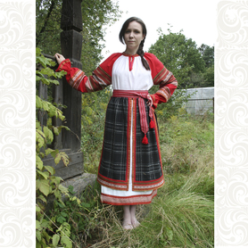 Приталенная модель хорошо сидит по фигуре, расклешенная книзу дает крупные мягкие волны. Сзади расположена застежка «молния». Талия дополнительно подчеркивается поясом. Плечики регулируются по длине. Сарафан украшен широкой полосой из жаккардовой тесьмы, вьюнка, золотистого шнура, кружева.